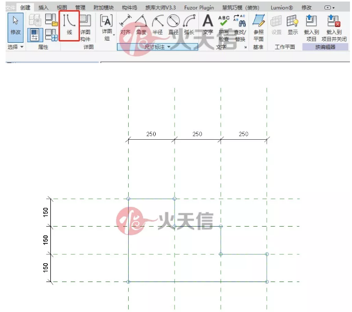 点击【创建】选项卡中的【线】功能,绘制出台阶的轮廓,如图: