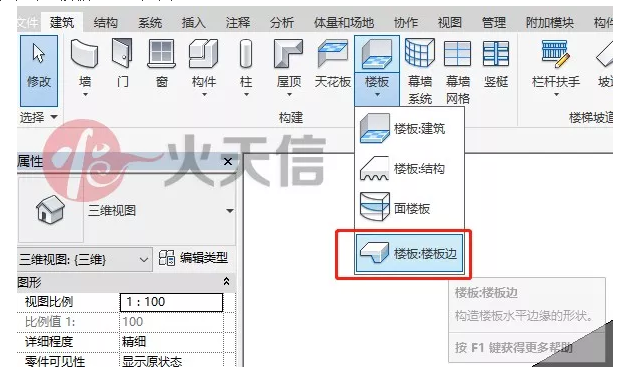 载入到项目后,切换至三维视图,点击【建筑】选项卡中的【楼板】,并点击弹出下拉菜单中的【楼板边】,如图: