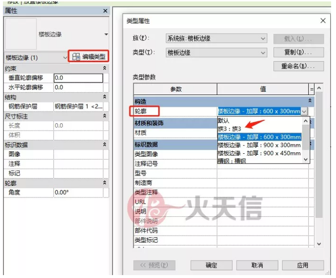 在属性栏中,点击【编辑类型】,在弹出的类型属性框中找到构造参数里面的轮廓设置,选择我们所载入进来的轮廓族,点击确定。如图: