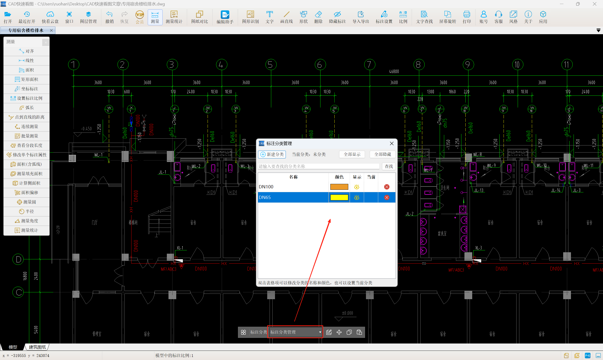 第四步,切换分类为DN65,测出平面图中所有DN65长度。