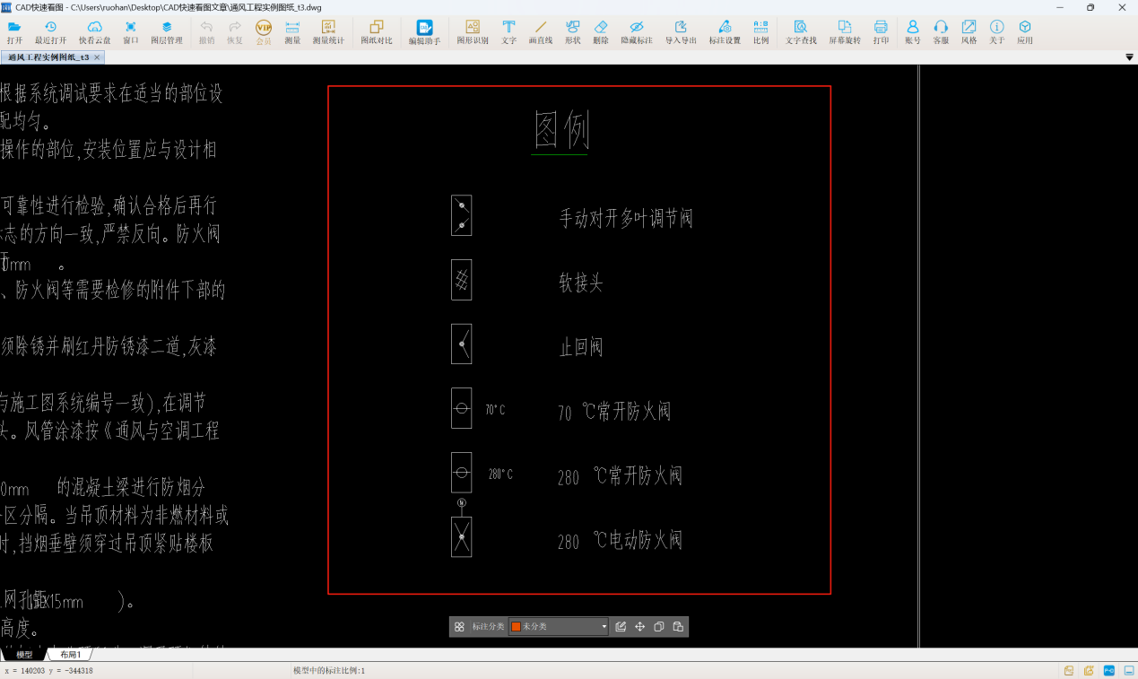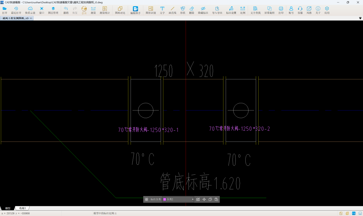 再以70℃防火阀为例,为了便于统计,可以在【标注分类】里新建分类为分类2,设置颜色为粉色。然后采用同样的方法,查找整张平面图,得到70℃防火阀-1250*320的数量为2。
