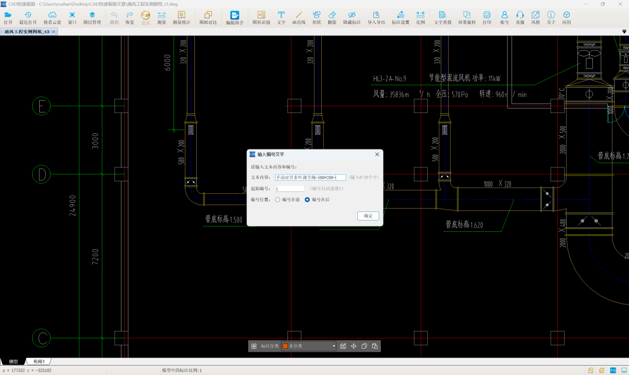 以手动对开多叶调节阀为例进行说明:使用【提取文字】功能,提取到“手动对开多叶调节阀”,点击复制到剪贴板。接着使用【文字】-【编号文字】功能,粘贴到文本内容中,其后补充“-500*200-”,点击确定。查找整张平面图,依次在在相应图形旁单击,在图纸上保留文字,确定数量为3个。